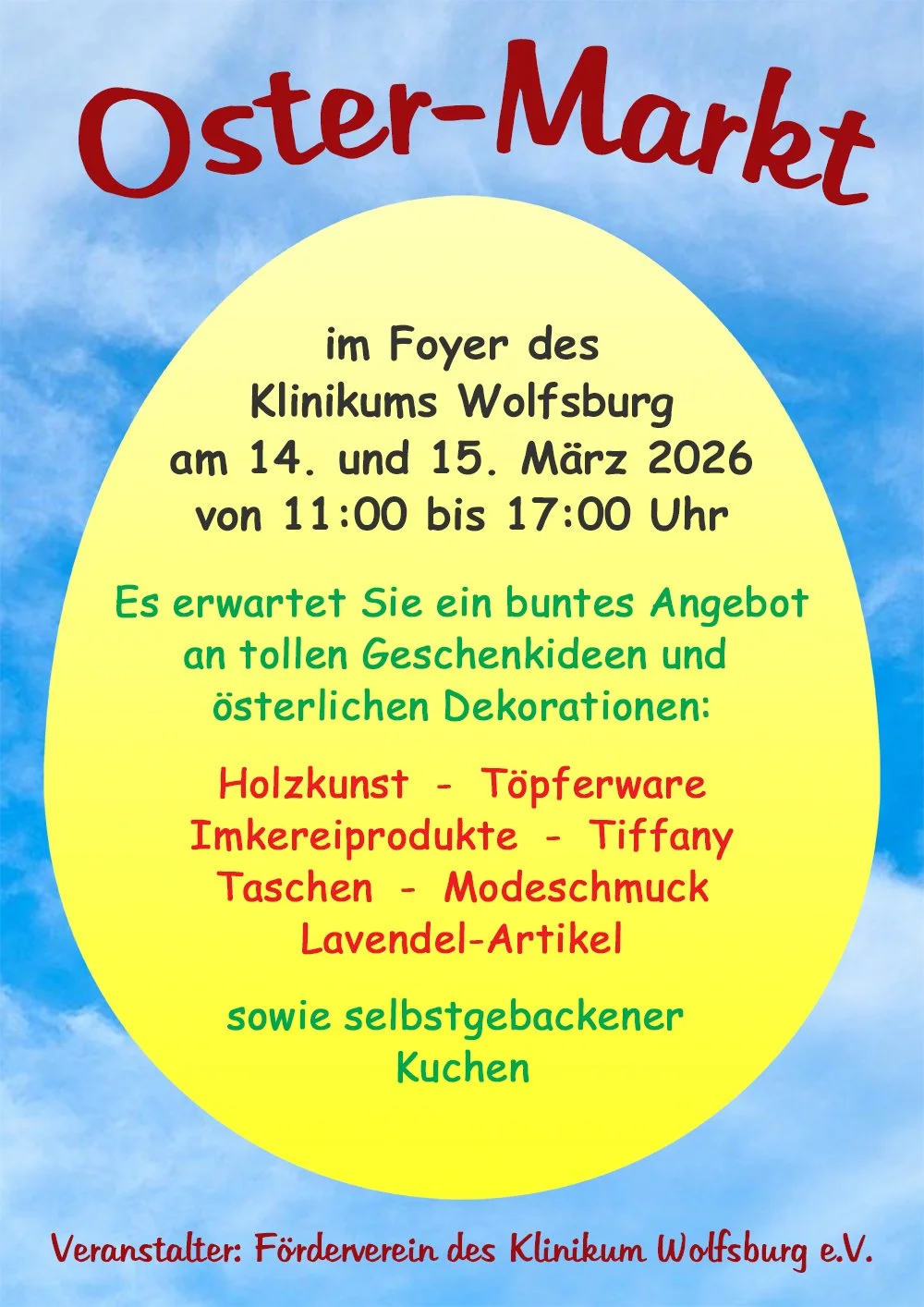 Unser jählich stattfindender Ostermarkt erwartet Sie am 14. und 15. März 2026 im Foyer des Klinikums Wolfsburg.